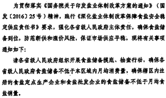 (九)改革食鹽儲備體系。建立由政府儲備和企業社會責任儲備組成的全社會食鹽儲備體系,確保自然災害和突發事件發生時食鹽和原碘的安全供應。各省(區、市)根據本地食鹽供需情況建立政府食鹽儲備,儲備量不得低于本省(區、市)1個月食鹽消費量,可以依托現有食鹽批發企業倉儲能力,也可以選擇具備條件的食鹽生產企業實施動態儲備,本級財政預算應安排資金對食鹽儲備給予貸款貼息、管理費支出等支持。加大對儲備補貼資金的審計力度,接受社會監督。完善企業食鹽儲備制度,限定食鹽生產、批發企業的最低庫存和最高庫存,防止食鹽市場供應短缺和企業囤積居奇,其中最低庫存不得低于本企業正常情況下1個月的平均銷售量,庫存具體標準由行業協會研究提出、工業和信息化部核定,各級鹽業主管機構要加強對庫存情況的監督檢查。鼓勵企業在供求關系穩定或產能大于需求時,在最低庫存基礎上建立成本自擔的社會責任儲備。