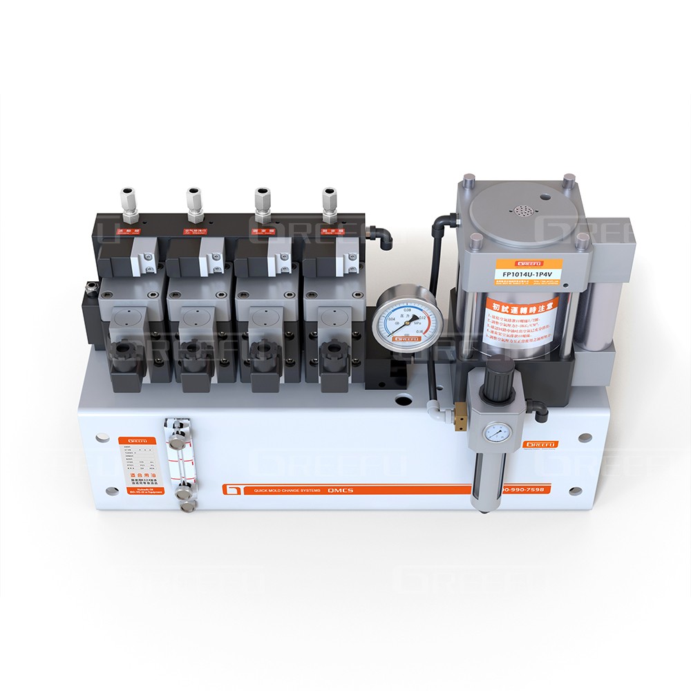 氣動式油壓單元FP1014,利用空氣壓力驅動泵浦, 由單體泵、壓力開關、電磁閥、氣控閥、 氣源處理器、油箱等組成