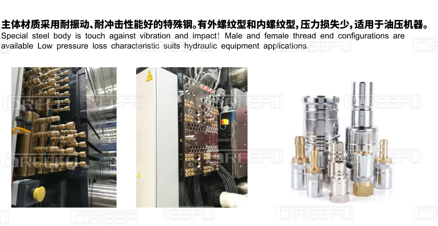 單路快插連接系統(tǒng):主體材質(zhì)采用耐振動(dòng)、耐沖擊性能好的特殊鋼。有外螺紋型和內(nèi)螺紋型,壓力損失少,適應(yīng)于油壓機(jī)。